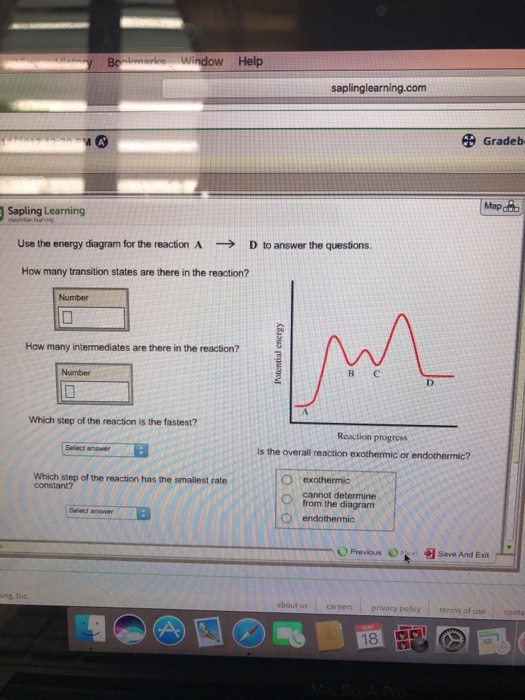 Use the energy diagram for the reaction A D to answer the questions. How many transition states are there in the reaction? transition states: Potential energy How many intermediates are there in the reaction? intermediates: Reaction progress Which step of the reaction is the fastest? Which step of the reaction has the smallest rate constant?